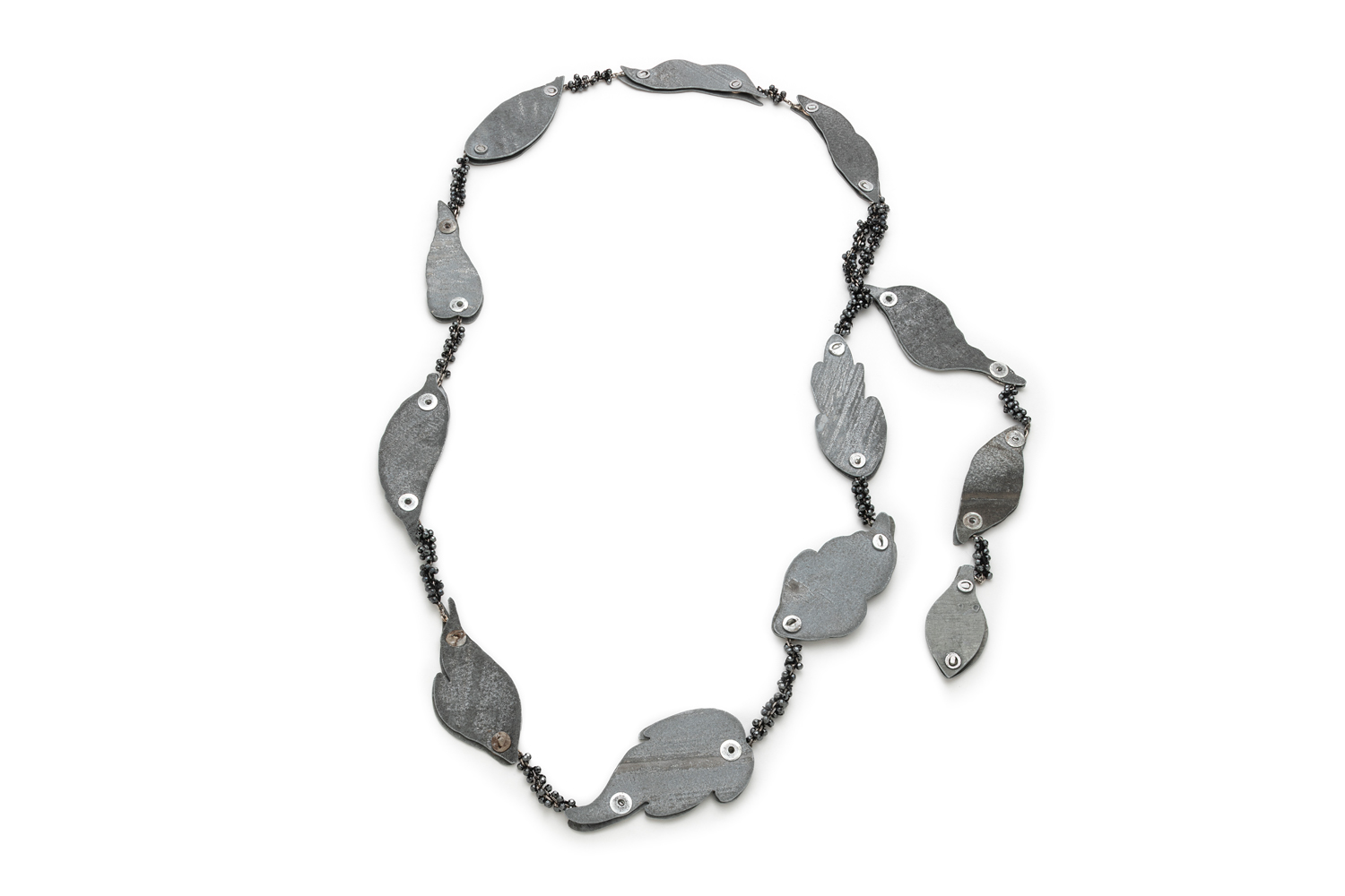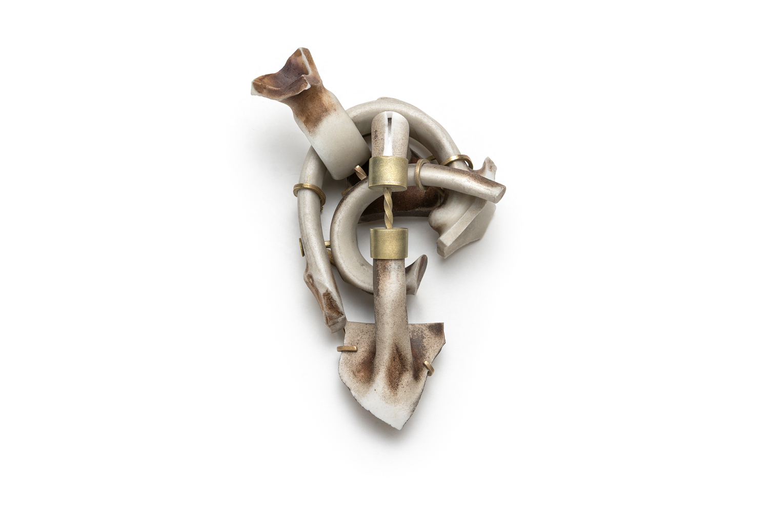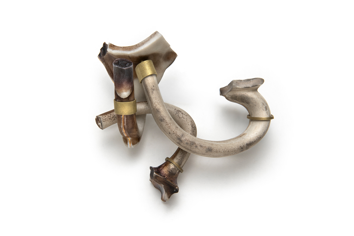 Immense étendue d’eau qui traverse le territoire et ponctue à la fois leur quotidien et leur créativité, le fleuve Saint-Laurent inspire et unit la démarche de ces trois artistes québécoises. Métaphore de leurs recherches formelles, l’estuaire est le lieu où se mêlent les eaux douces et salées, entre fleuve et mer. C’est l’appel du large, là où leurs pratiques artistiques et explorations en atelier se rencontrent et se définissent autour de la céramique et des métaux ainsi que d’éléments récoltés, façonnés et détournés. Leur attrait pour les marées, la dérive des glaces et tous ces artéfacts rejetés sur les rivages sont autant de fragments de mémoire exprimés sous forme de bijoux.